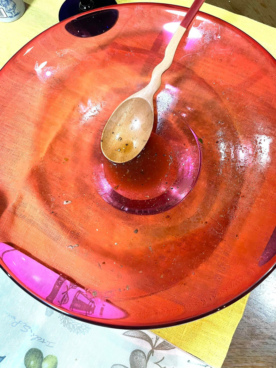 今日の晩ごはんは、パウル・クレーの豚のヒレ肉とシャンピニオンのレシピで作り、ヨーナスさんの美しい赤いガラスの大皿に盛りつけました。